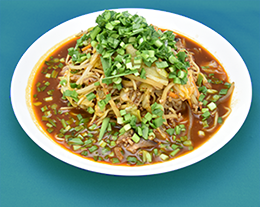 1をトッピングし、花椒油を振りかけて出来上がり。