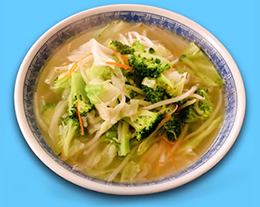 麺を茹でて丼に入れ、スープを入れて野菜を盛り付ける