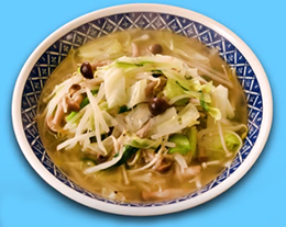 麺を茹でて丼に入れ、スープを入れて野菜を盛り付ける