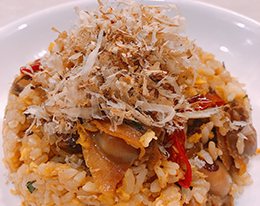 仕上げに大葉、辣鮮王で入れて、いわし削りぶしをふりかけて出来上がり